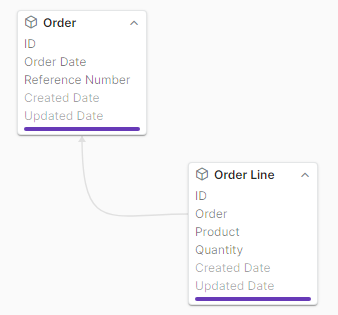 A one-to-many relationship is illustrated in figure 3 with a data model consisting of `Order` and `Order Line`. An order line can be connected to only one order through its property `Order`**.** An order can have any number of order lines referencing it.