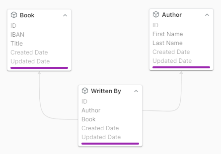 <table><thead><tr><th width="276.3333333333333">ID [primary key]</th><th width="253">Book [foreign key]</th><th>Author [foreign key]</th></tr></thead><tbody><tr><td>637f9382462b2a1d0e6b823a</td><td>6376344c01ed7ce7fb4f1967</td><td>6376347f4a2bd917bc5128f2</td></tr></tbody></table>