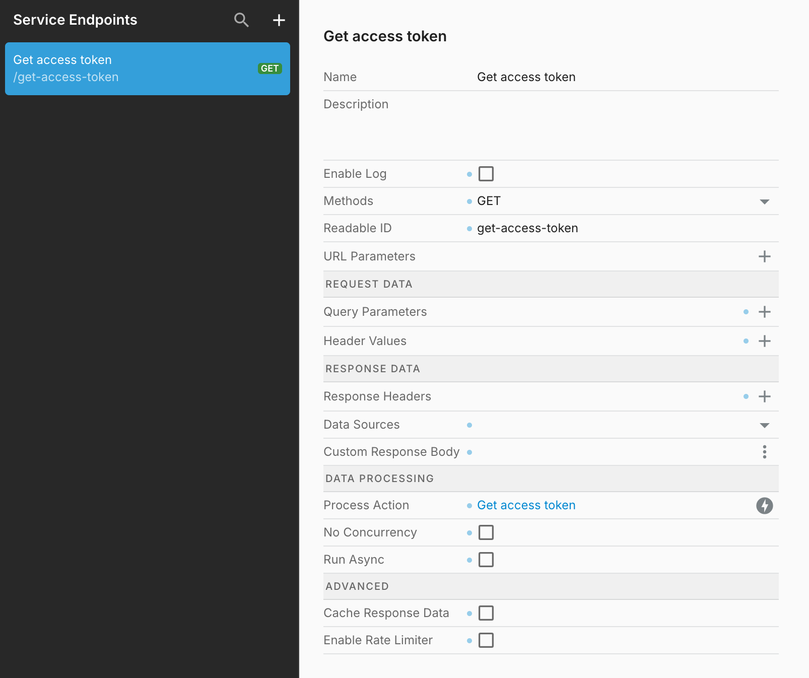 * In the **Name** field, enter a new name for the endpoint, for example `Get access token`. When you set a name, the **Readable ID** field will be automatically populated.